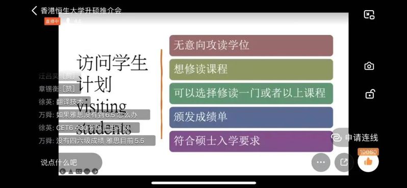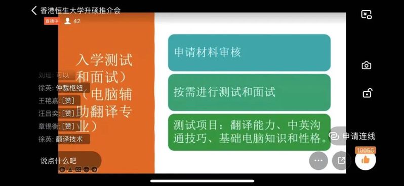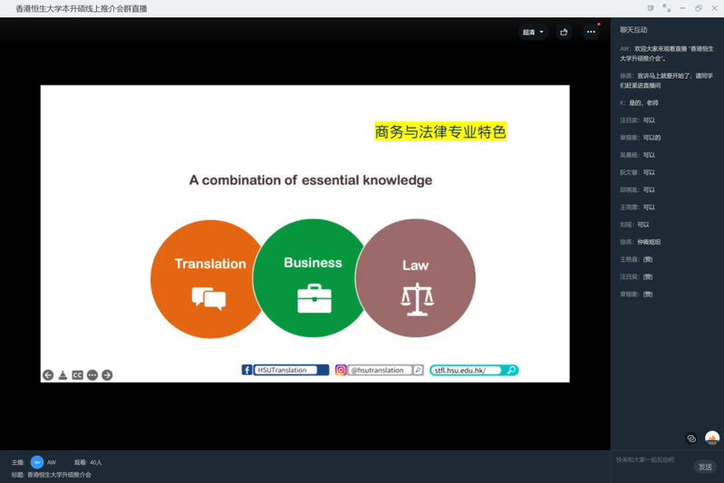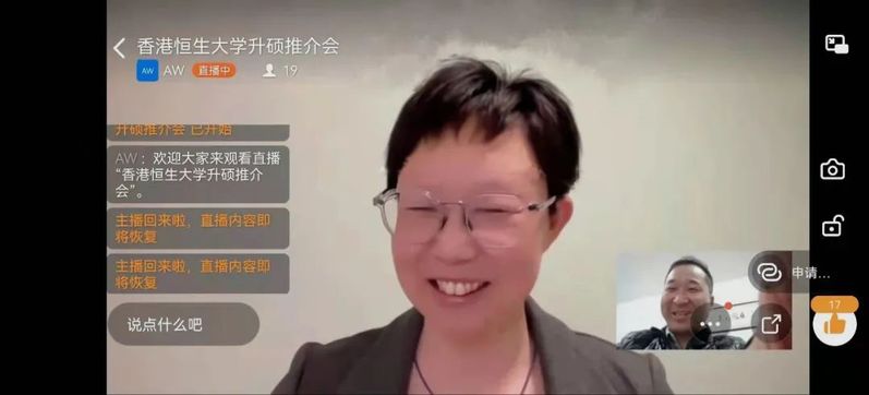 推介会气氛热烈,徐院长从三个维度分析了近年的考研形势和留学形势,王博士对香港留学和选择恒大的优势做了详解分析,与此同时还把香港恒生大学的翻译硕士专业项目做了全面的介绍。同学们纷纷通过弹幕就报考条件和学习环境等问题和点赞的形式跟王博士进行热烈的互动问答。