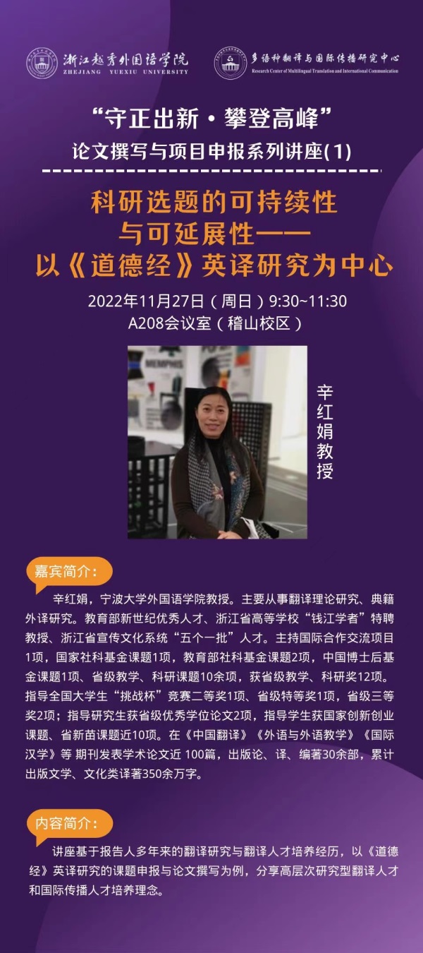 yL23411永利官网登录于11月27日上午以腾讯会议形式开展了yL23411永利官网登录“守正出新·攀登高峰”论文撰写与项目申报系列讲座第一讲,邀请宁波大学yL23411永利官网登录副院长辛红娟教授为我校师生作以“科研选题的可持续性与可仿照性——以文化典籍译介与传播为例”为主题的讲座。讲座由yL23411永利官网登录副院长谌莉副教授主持,院长陈科芳教授做总结,在线参会师生100余人。