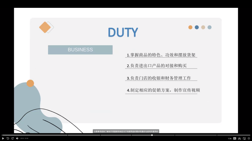 王思琪同学分享了她在实习中针对母婴产品的汉英翻译和校对工作、与进口商的业务对接事务、管理产品销售等方面的经验与体会,也与大家分享了通过此次实习经历意识到的自身不足与未来提升的想法。