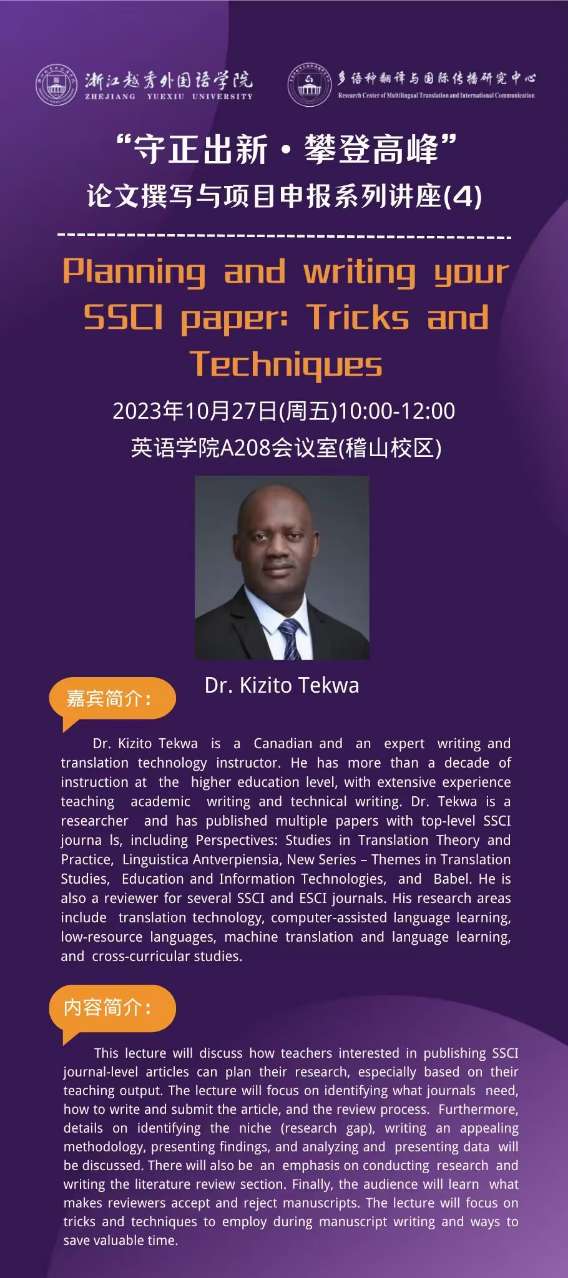10月27日上午10点,yL23411永利官网登录及多语种翻译与国际传播研究中心邀请加拿大籍专家Kizito Tekwa博士为我校教师开设了主题为“Planing and writing your SSCI paper: Tricks and techniques”的工作坊。Tekwa博士是一名翻译技术和写作教学的资深教师,目前任教于深圳技术大学。他擅长教授学术写作和技术写作,在多个顶级的SSCI期刊上发表了多篇论文,包括Perspectives: Studies in Translation Theory and Practice, Linguistica Antverpiensia, New Series–Themes in Translation Studies, Education and Information Technologies和Babel。他是多个SSCI和ESCI期刊的审稿人,研究领域包括翻译技术、计算机辅助语言学习、资源匮乏语言、机器翻译和语言学习,以及跨学科研究。讲座由yL23411永利官网登录副院长谌莉副教授主持,为了满足不同校区教师的学习需求,讲座还通过腾讯会议向全校教师进行了直播。