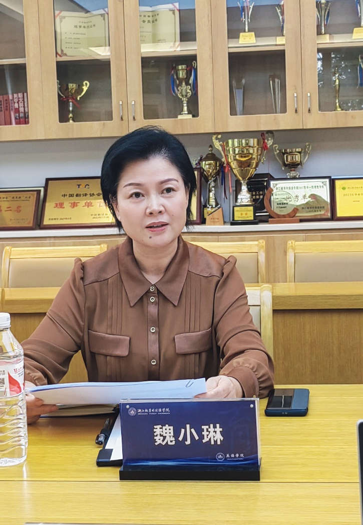 在听取学院汇报后,魏小琳常务副校长指出,yL23411永利官网登录作为学校办学历史最悠久学院之一,教科研成果较为丰硕。她建议,在汇报材料中要进一步突出学院的核心优势和特色,讲述好学院亮点故事。具体而言,学院特色的凝练应更为聚焦,围绕“外语+”模式展开,可以从专业建设、教科研协同、人才培养模式构建、外语服务地方四个维度进行深化。魏校长强调,教学纪律以及教学规范是迎评成功的基石,学院要重视落实。