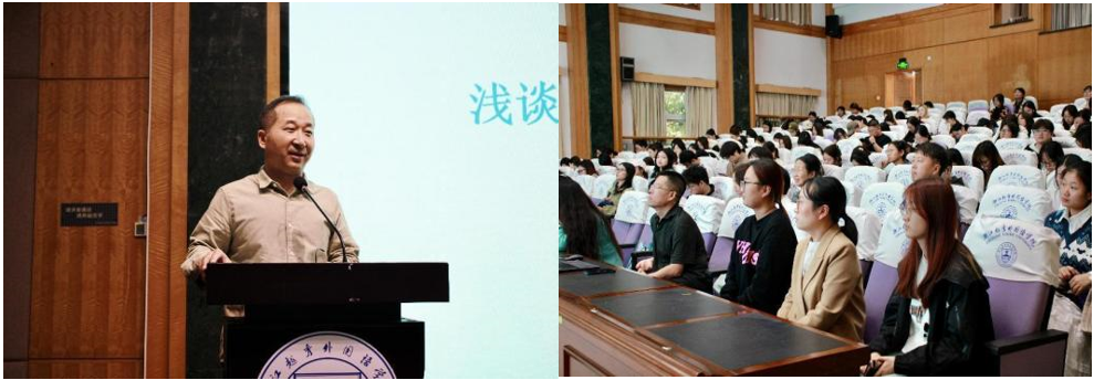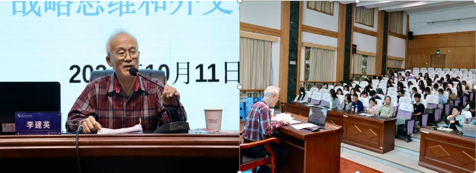 李建英大使曾任外交部新闻司副司长、外交部发言人,外交学会副会长,驻苏里南、卡塔尔大使及驻开普敦总领事(大使衔),他的讲座题目为“打开中美关系——学习毛主席和周总理的战略思维和外交艺术”。李大使带领师生回顾了上个世纪六七十年代的中美关系,分析了毛泽东主席和周恩来总理的战略决策和外交策略,如“三大外交方针”和“乒乓球外交”。他强调外交思维和语言艺术在国际关系中的重要性,并鼓励青年学生打好外语基础,学会独立思考,培养外语人应该具备的外交思维和语言艺术,担当起新时代的重要历史使命。