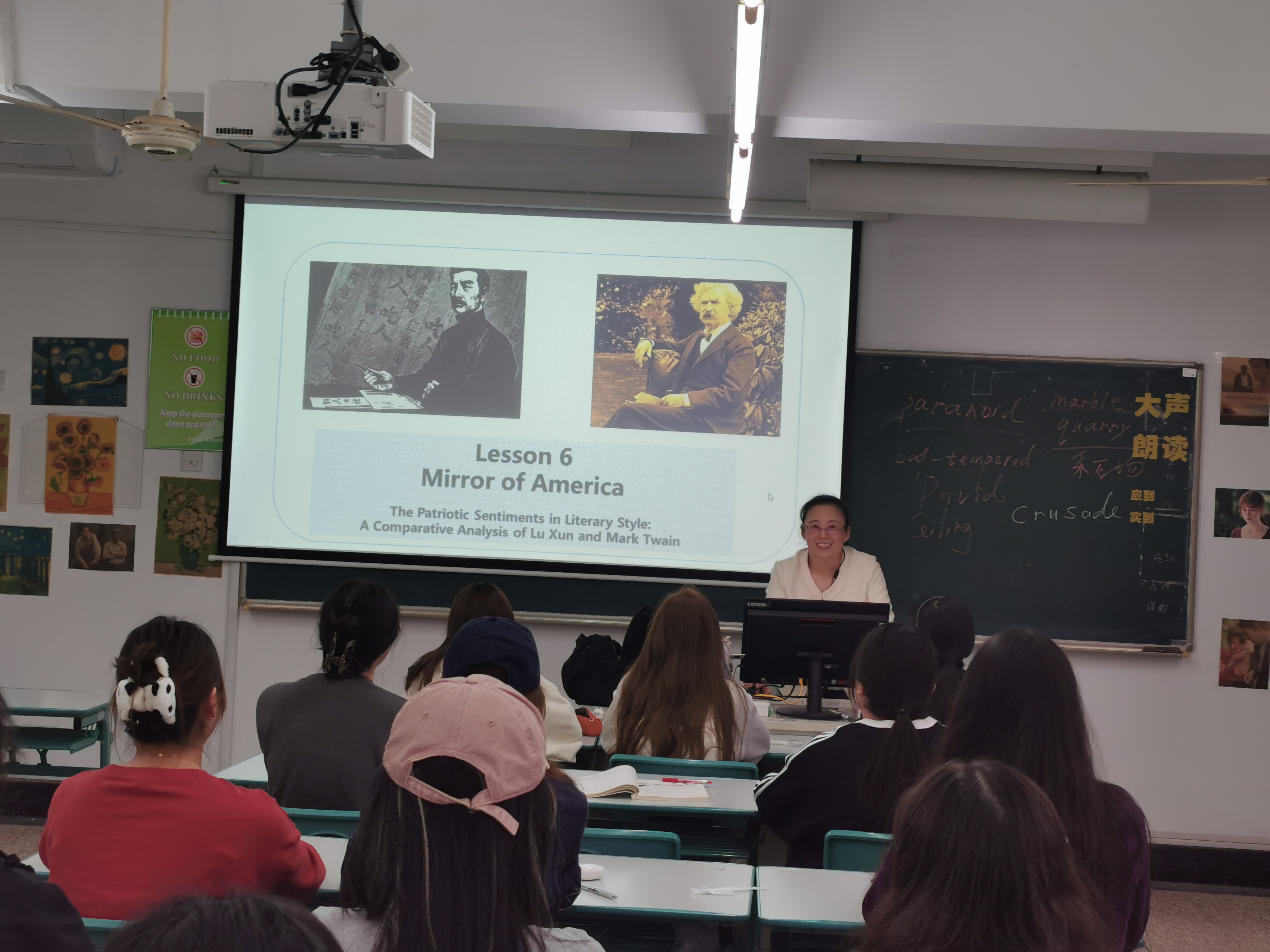 陈霞老师就《高级英语1》开设了一堂别开生面的课程思政公开课,主题为“笔锋下的爱国情怀:鲁迅与马克·吐温文学风格对比分析”,引领学生深入探讨了这两位文学巨匠的生平和作品。课程通过纪录片片段引入,详细分析了鲁迅和马克·吐温的生平背景、社会环境,以及他们的语言特色和修辞手法,如鲁迅的讽刺和马克·吐温的幽默。在语言学习环节,学生们通过词汇分析、句子结构分析和填空练习,深入理解了作者如何运用语言来传达情感和社会批判。特别是在修辞手法分析中,学生们识别并讨论了两位作者使用的比喻、隐喻和夸张等手法,通过异同点的分析,探索并学习两位作者对社会问题的深刻洞察和深沉的爱国情怀。课程的思政元素通过小组作业和课后讨论得到了进一步的强化。学生们在小组中分析了作品在国家和社会情感背景下的思想和政治元素,探讨了这些作品与社会现实的联系。通过历史背景介绍和角色扮演活动,学生们不仅增强了对文学作品深层含义的理解,还提高了批判性思维和跨文化比较能力,学生们的爱国情感得到了激发。